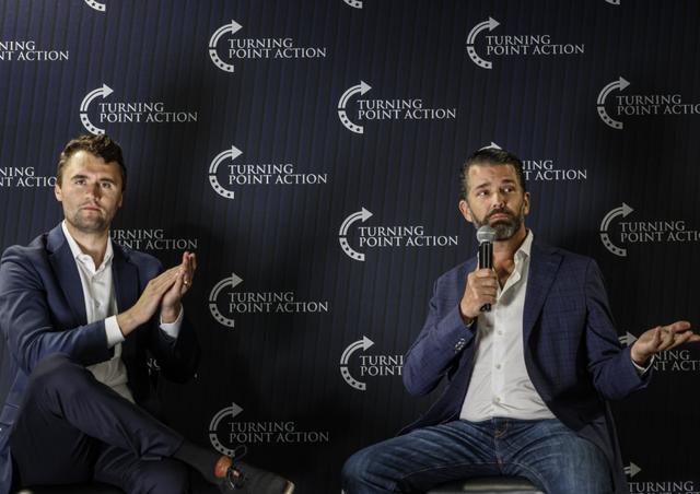 包括小唐纳德·特朗普(右)在内的美国右翼关键人物,近年来都曾出席韩国"建设韩国"年度会议。查理·柯克(左)则在犹他州遇刺身亡数日前亲临现场。| 杰弗里·菲尔普斯/美联社
