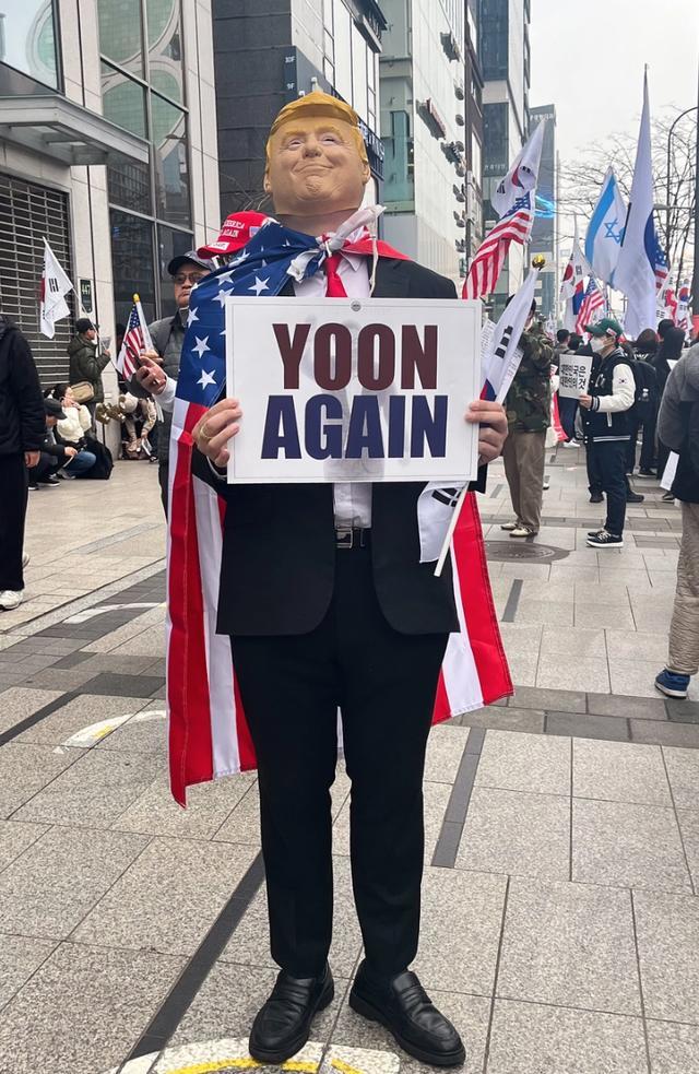 首尔,一名男子头戴唐纳德·特朗普的面具,身披美国国旗作斗篷,正走在首尔最繁华的街道之一。他大步流星,胸膛挺起,仿佛自己就是总统本人。他周围簇拥着一群戴着红色帽子的人——虽然红色是韩国主要保守党国民力量党的颜色,但这里所见的是唐纳德·特朗普品牌标志性的那种独特红色。